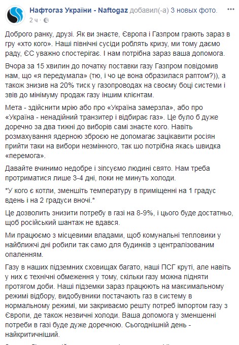 "Цель - осуществить мечту или "Украина замерзла", или "Украина - ненадежный транзитер и отбирает газ". Это было бы очень уместно за две недели до выборов сами знаете кого... Давайте поступим нехорошо и испортим человеку праздник. Нам надо продержаться только 3-4 дня, пока не пройдут холода. У кого есть котлы, уменьшите температуру в помещении на 1 градус днем и на 2 градуса ночью", - говорится в сообщении.