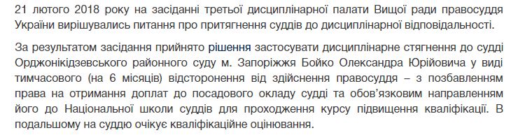 В пресс-центре Орджоникидзевского районного суда города Запорожья сообщили о решении палаты Высшего совета правосудия. На заседании было принято решение о дисциплинарном взыскании с судьи Александра Бойко.