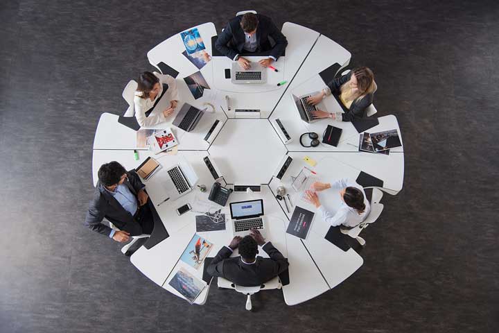 Кабинет начальника департамента превращается в зал для заседаний несколькими движениями. Этому способствует стол-трансформер, внутрь которого прячутся стулья — тоже складные. Он может быть монохромным или иметь фривольно разноцветные сегменты. Все зависит от направленности компании.