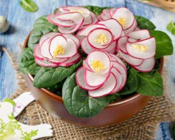 7. Сверху выложить листья салата и кружочки редиса, имитируя цветок фиалки.