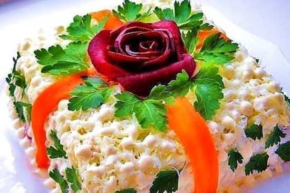 8. Верх салата украсить петрушкой, розой из свеклы или ленточками из моркови.