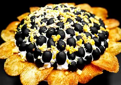 5. По кругу воткнуть чипсы, на середину выложить маслины.