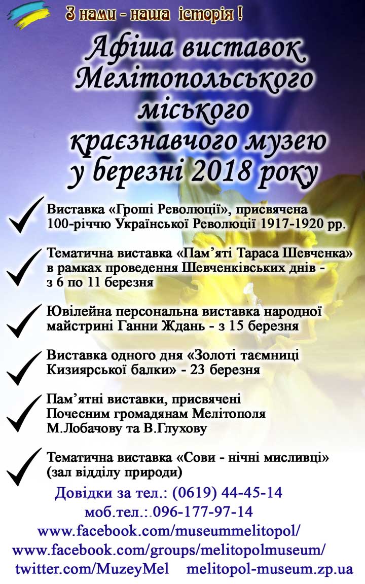 Мелитопольский городской краеведческий музей приглашает горожан на выставки, которые будут работать в музее в марте.