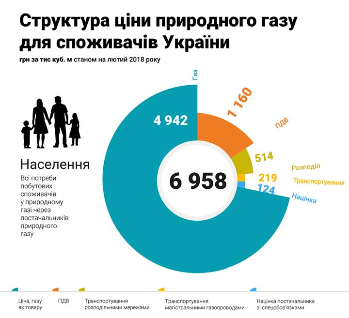 По данным НАК "Нафтогаз Украины", наибольшую долю в структуре составляет цена газа как товара - 4942 грн. Кроме того, 1160 грн приходится на НДС, 514 грн - на транспортировку по распределительным сетям, 219 грн - на транспортировку по магистральным газопроводам, 124 грн - наценка "Нафтогаза".