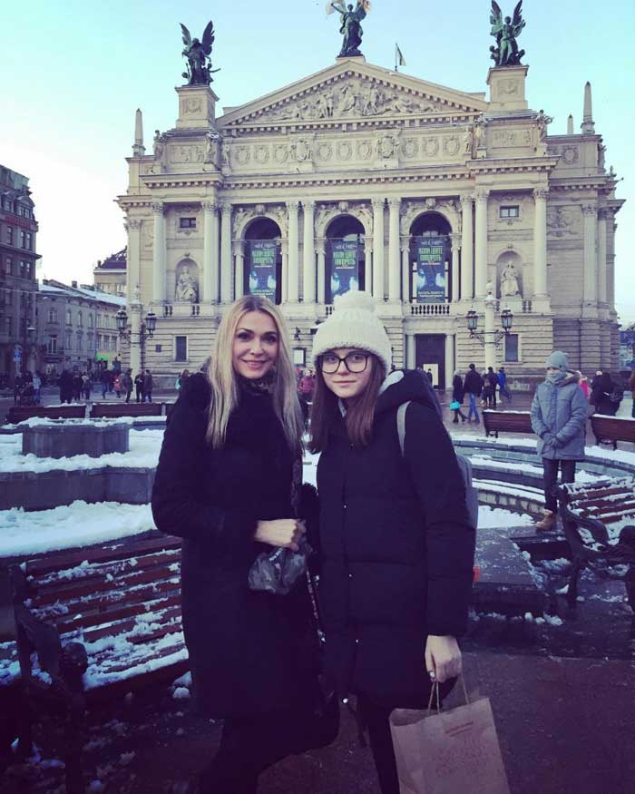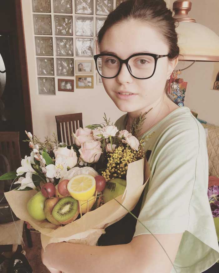На фото дочь Ольги, Анна Борисюк, позирует с праздничным букетом.