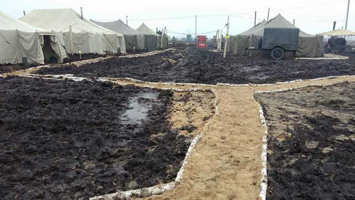 Ранее в сети появились фото военного полигона "Широкий Лан" под Николаевом. На фото было изображено ужасное состояние палаточного городка - вся территория в воде и грязи, палатки очень сильно затоплены.