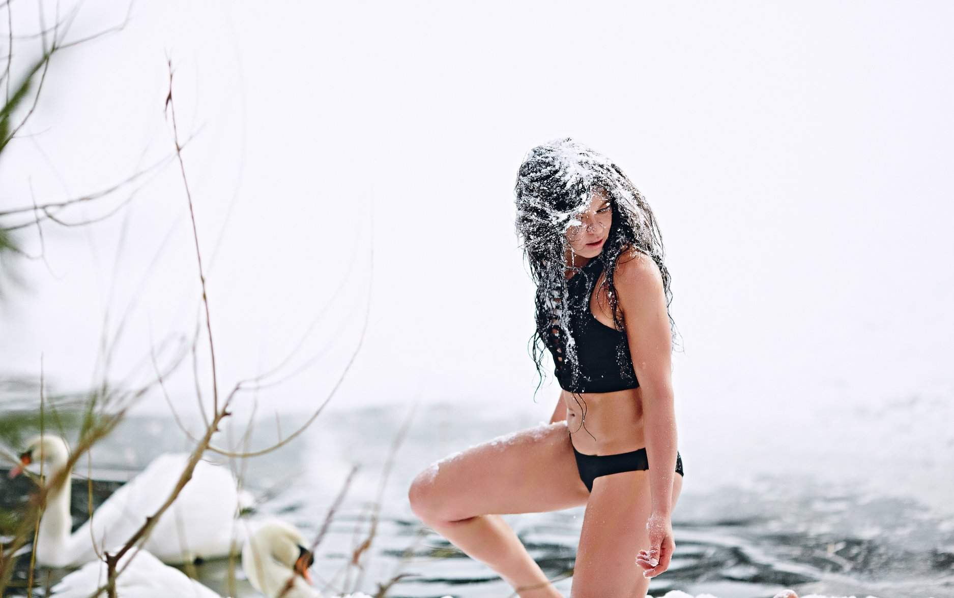 На всех фото певица запечатлена в черном купальнике и с распущенными волосами.