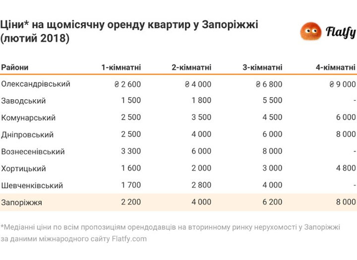 Наибольшим спросом в Запорожье пользуются квартиры Вознесеновского района. Жилье с одной комнатой предлагают по цене 3,3 тысячи грн, двухкомнатное – по 6 тысяч грн, а трехкомнатное – по 8 тысяч гривен в месяц. Согласитесь, сложно не заметить различие в стоимости аренды более чем в два раза по отношению к цене квартир в районах с самыми низкими ценами.