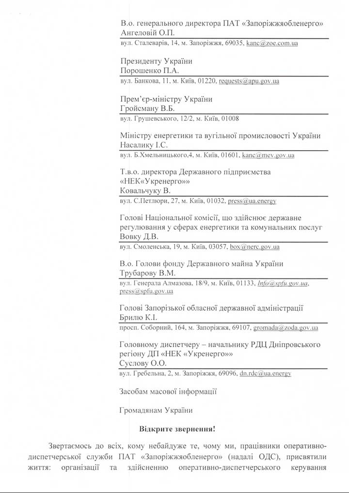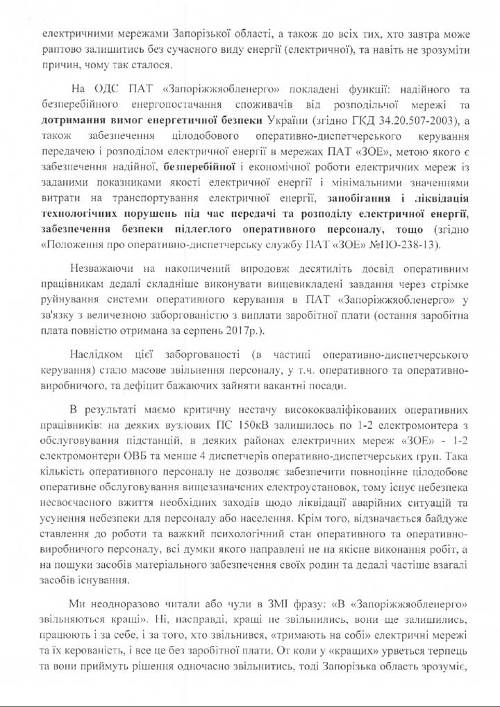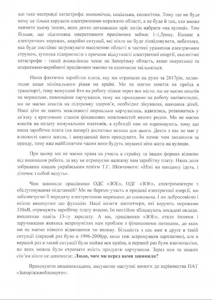 — Мы неоднократно читали или слышали в СМИ фразу: «В «Запорожьеоблэнерго» увольняются лучшие». Нет, на самом деле, лучшие не уволились, они остались, работают и за себя, и за того, кто уволился, «держат» на себе электрические сети и их управляемость, и все это без заработной платы. Вот когда у «лучших» лопнет терпение и они примут решение одновременно уволиться, тогда Запорожская область поймет, что такое в действительности катастрофа: экономическая, социальная, экологическая… Коллапс в электрических сетях, аварийные ситуации, которые никто не будет ликвидировать, опасность, которая будет постоянно угрожать населению области в части поражения электрическим током, остановка предприятий по причине отсутствия электроэнергии, экологические катастрофы - такой апокалипсис ждет Запорожскую область, если оперативные и оперативно-производственные работники массово и одновременно уволятся, — говорится в тексте письма, которое сотрудники компании прислали в редакцию 061.