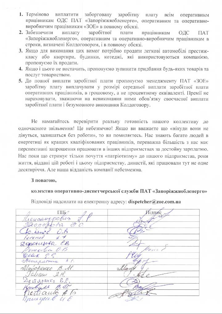 Сотрудники оперативно-диспетчерской службы «Запорожьеоблэнерго» написали открытое письмо Президенту, премьер-министру и другим высокопоставленным чиновникам с требованием решить ситуацию с невыплатой зарплаты. В противном случае они обещают устроить массовое увольнение.