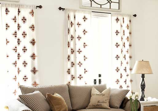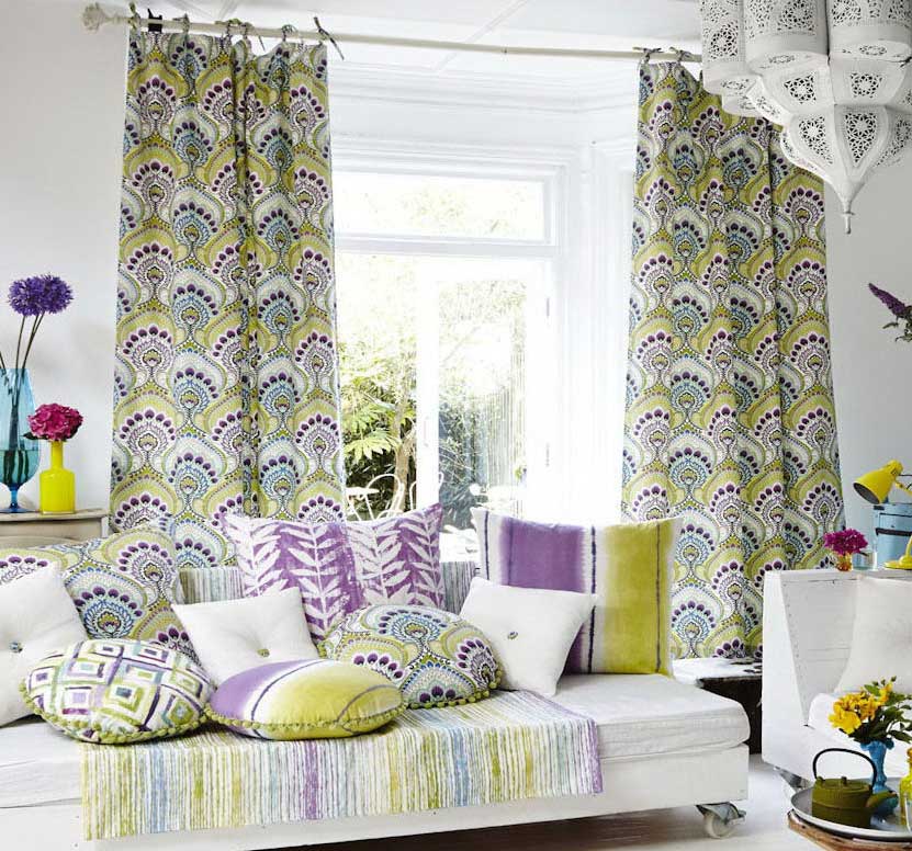 2. Не стоит все внимание оттягивать именно на шторы. Поэтому если вы планируете купить яркие шторы, то это должно гармонировать со всей комнатой. Например, можно положить такие же яркие подушки на диваны, постелить какую-то скатерть с похожими мотивами на столик. Возможно, повторить часть рисунка или расцветки штор в рисунке ковра и т. д. Не нужно делать так, чтобы в блеклой комнате, ярким пятном были лишь одни шторы, добавьте еще ярких пятен в интерьер. И не забывайте, что чересчур яркие шторы быстро надоедают, и не способствуют отдыху и успокоению, поэтому не выбирайте такой вариант для спальни.