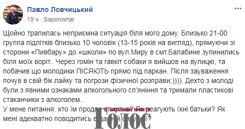 Около десяти пьяных подростков угрожали жителю Запорожской области расправой