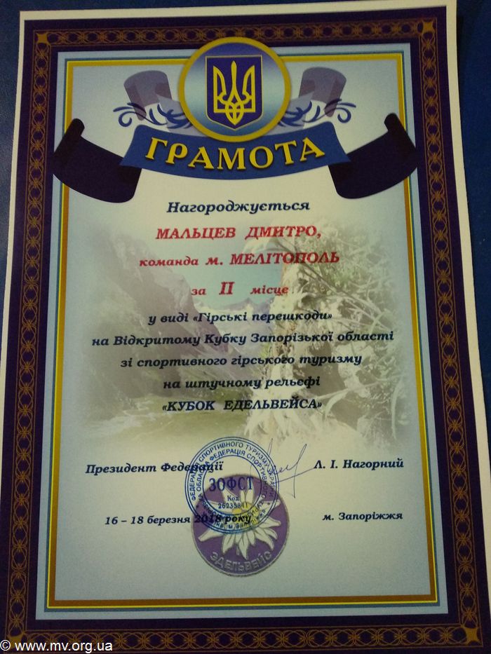 Мелитопольский спортсмен Д. Мальцев и кандидат в мастера спорта Украины по спортивному туризму С. Бебешко стали серебряными призерами в командном зачете на "Кубке Эдельвейса". В их арсенале также и занятые вторые места на каждой из дистанций. Управление молодежи и спорта поздравляет спортсменов с удачным выступлением и желает новых побед и свершений!