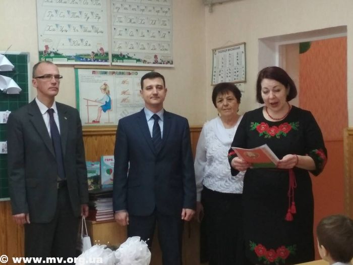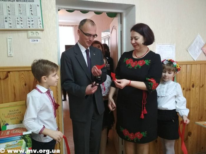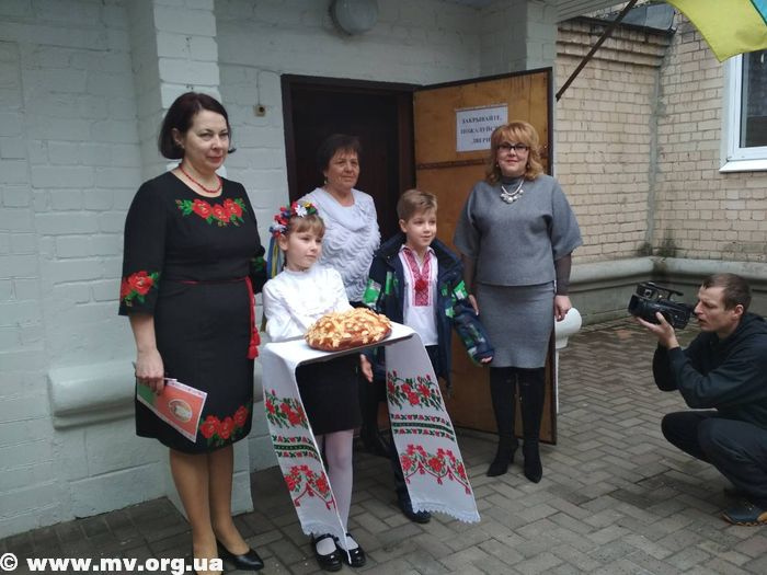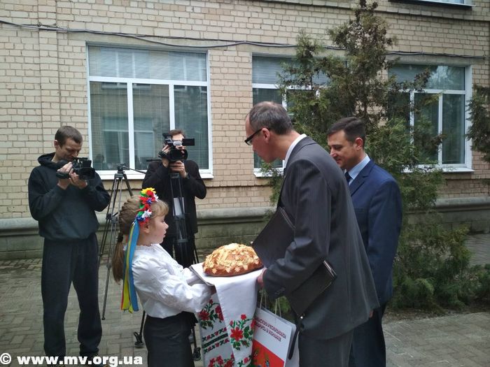 На открытии присутствовали почетные гости: заместитель городского головы Сергей Прийма и первый секретарь Посольства Республики Беларусь в Украине Андрей Губкин. Гостей прямо на пороге школы по доброй украинской традиции встречали караваем и солью.