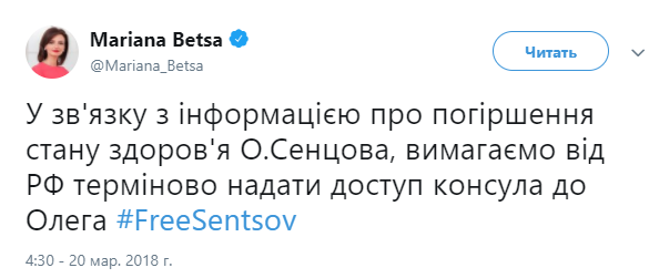 МИД Украины потребовал от российской стороны допустить к Сенцову консула, сообщила в своем Twitter спикер министерства Марьяна Беца.