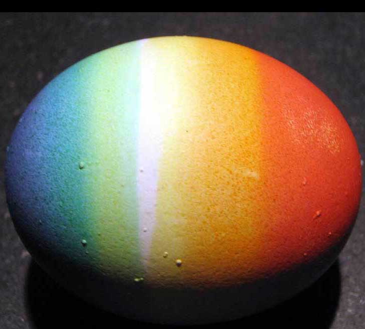 5. Чтобы окончательно придать пасхальному яичку сходство с радугой необходимо добавить зеленый цвет. Для этого яйцо опускается желтым концом на одну треть в концентрированный отвар шпината (залить водой и уваривать 30 минут на медленном огне, дать настояться) или раствор бриллиантовой зелени, разбавленный водой.