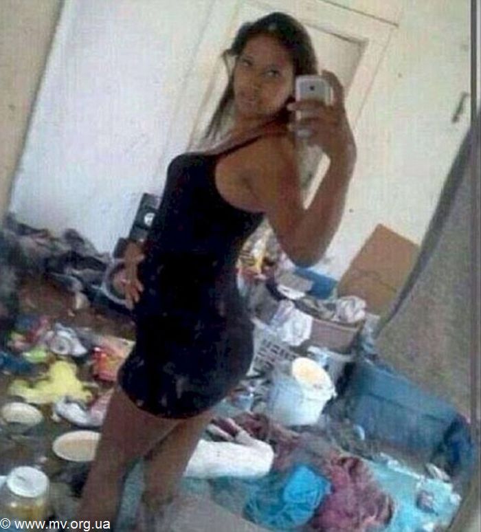 В центре этого кадра оказалась не девушка, а массивный бардак у нее за спиной. Серьезно, ну как можно довести жилище до такого состояния?