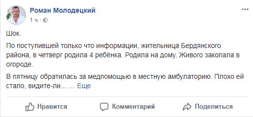 Жительница Запорожской области закопала в огороде своего новорожденного ребенка. Об этом на своей странице в соцсети сообщил глава Бердянской райгосадминистрации Роман Молодецкий.
