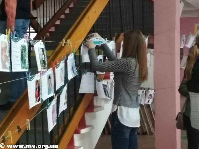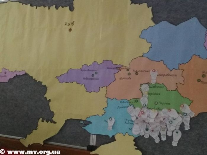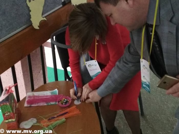 В холле расположилась локация, похожая на фотосушку, только вместо фотографий – «паспорта» участников, где они размещают информацию про себя и контактные данные. С заинтересовавшим их коллегой педагоги смогут связаться после конференции, обсудить интересующие их вопросы. Также в холле между вторым и третьим этажами размещена карта Украины, на которой выделены те области, из которых приехали участники. На бумажных лампочках все желающие могут написать проблемы, с которыми им пришлось столкнуться в своей деятельности и ее решение. После между людьми, которые желают общаться в дальнейшем, будут протянуты ниточки. Получится такая себе карта межрегиональных педагогических связей.