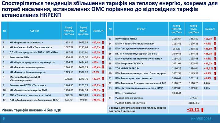 Больше всего подняла тарифы на тепловую энергию "Славянская ТЭС" – на 70,3%. На втором месте по подорожанию – тепло от КП "Боярское ГПУЖКХ" (+37,7%), на третьем – от Могилев-Подольского "Теплоэнергетика" (+37,1%). Более чем на 20% повысилась тепловая энергия у "Бориславтеплоэнерго". "Червоноградтеплокоммунэнерго", "Токмак теплоэнергии", "Прилукитеплоснабжения", Бучанского "Теплокоммунсервиса".