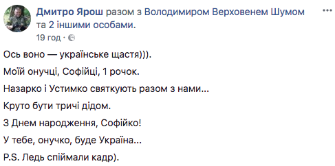 "Вот оно - украинское счастье. Моей внучке, Софийке, 1 годик. Назар и Устимко празднуют вместе с нами. Круто быть трижды дедом. С Днем рождения, Софийка! У тебя, внучка, будет Украина. Р.S. Едва поймали кадр", - написал Ярош.