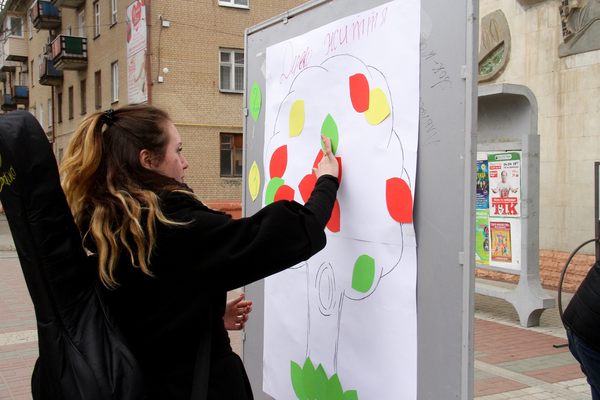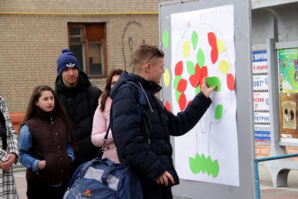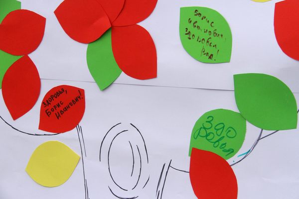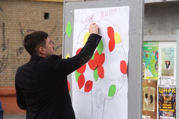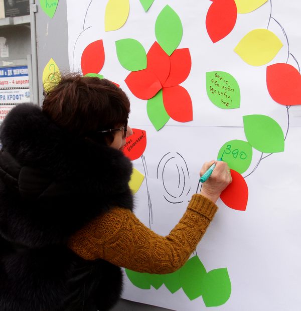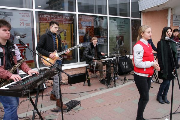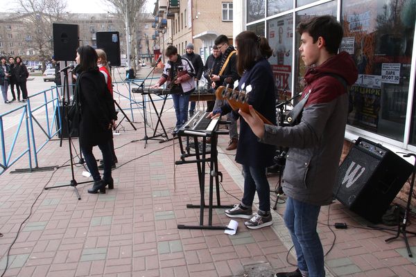 Возле входа в ДК мелитопольская молодежная группа "Город М" поет и играет для мелитопольцев. Рядом - актеры народного студенческого театра "Гуадеамус" МГПУ им. Б. Хмельницкого предлагают наполнить листьями "Дерево жизни". Листик зеленого цвета стоит 2 грн., желтого - 3 грн., красного - 5 грн. После опускания в бокс для сбора пожертвований определенной суммы, жертвователь может наклеить листок на нарисованное на большом листе бумаги дерево. Есть мелитопольцы, которые на своем листочке пишут пожелания Маэстро, а есть такие, которые "покупают" листья "Дерева жизни" за сумму, в разы превышающую заявленные.