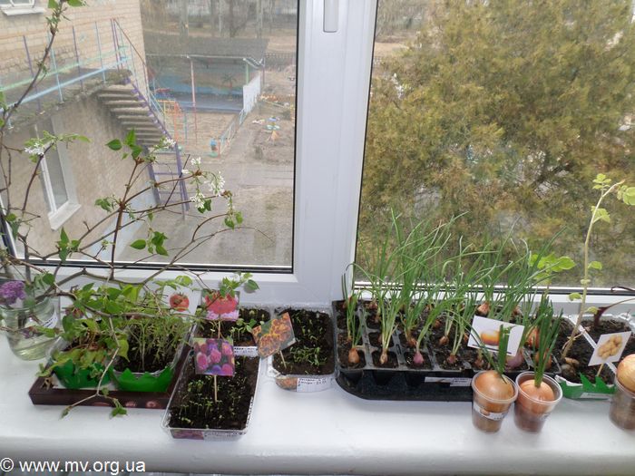 На улице еще далеко не тепло, а в группах садика уже расцвели веточки черешни и сирени, появились березовые сережки. А в ящиках и стаканчиках уже ожидает посадку в грунт рассада помидор, огурцов и гороха, скоро зацветут свекла и морковь, а зеленый лук ежедневно попадает на обеденные столы. И все это выращено детскими руками. Ежедневно воспитанники детского сада заботятся о растениях, создают для них благоприятные условия и наблюдают за ними.