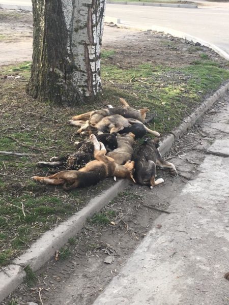 Так жители Бердянска сегодня утром, 1 апреля, увидели на пересечении улиц Кирова и Морозова гору трупов бездомных псов.