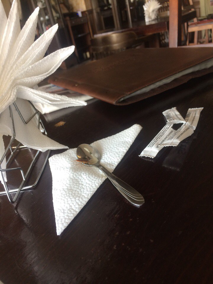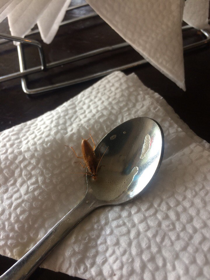 Пользователи сети поделились в соцсети фото, как в пабе «Пинта» усатый тараканчик с оставленной чайной ложки на столе мило попивал остатки кофе.