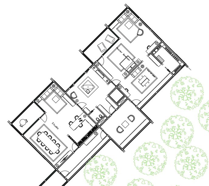 В центральном здании должны были находиться зимний сад, гостиная с обеденной и каминной зонами и двумя верандами, 25-метровый бассейн, сауна, турецкая баня, массажные комнаты, зона отдыха и длинная веранда для принятия солнечных ванн. Все северное крыло здания предназначенное для размещения одного человека. Для господина в доме планируется отдельная спальня. В этом же крыле располагается студия с большим столом на 10 человек и барной стойкой. А между спальней и студией - ванная комната с джакузи.