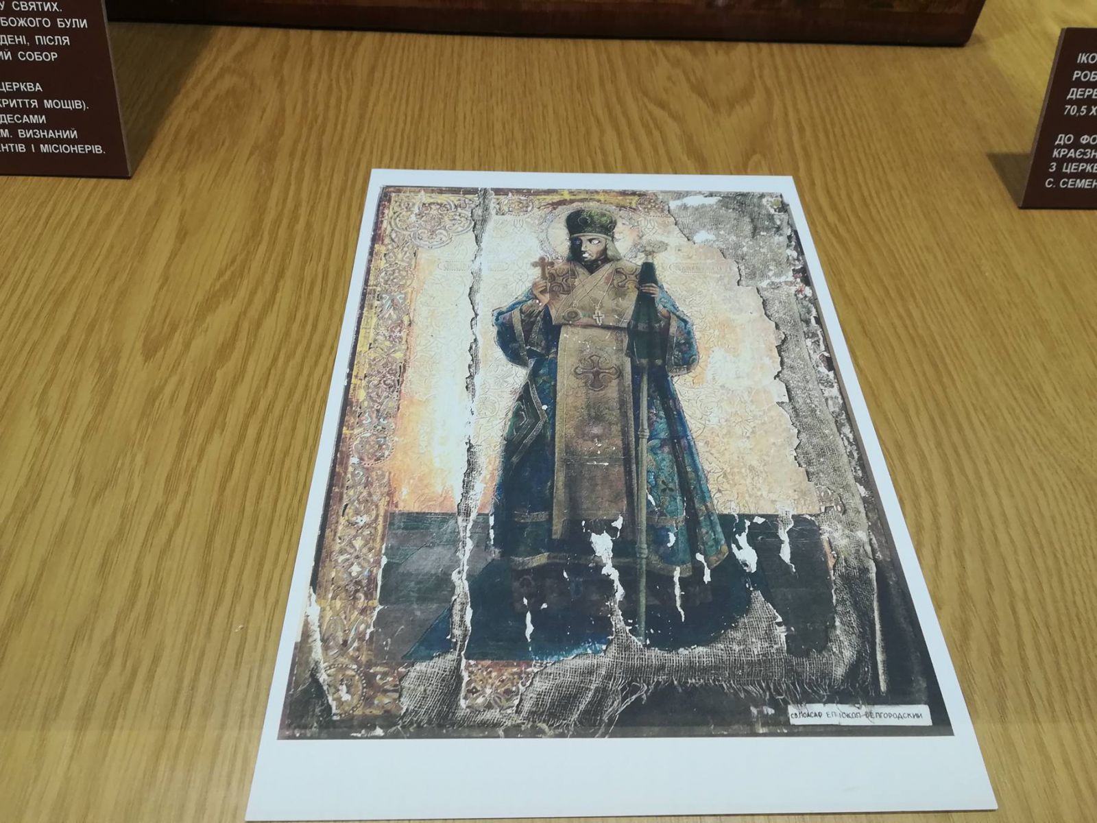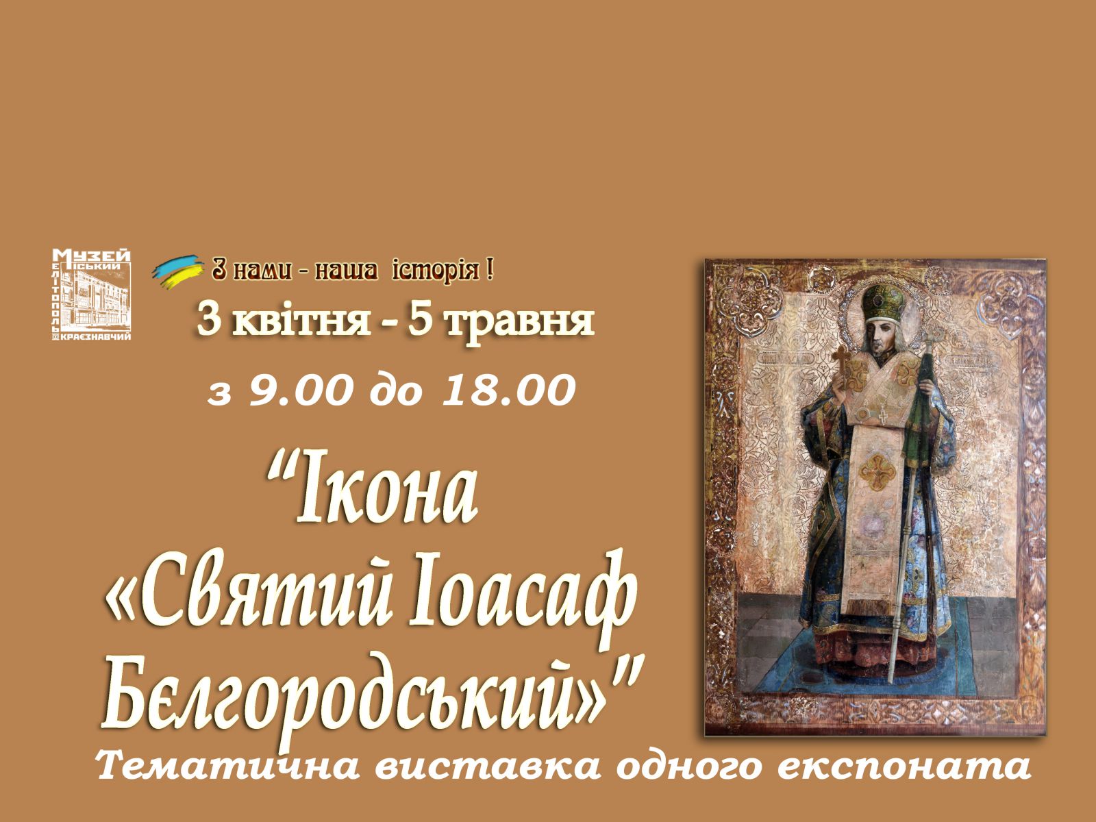 По словам научного сотрудника музея Татьяны Шевченко-Чепелевой, эта икона второй половины 19 столетия пополнила музейные фонды в 1963 году. А попала она сюда из храма во имя св. архистратига Михаила села Семеновка (Мелитопольский район). В центре иконы изображен святитель Иоасаф Белгородский - выдающийся церковный деятель, просветитель, талантливый писатель, педагог, непревзойденный оратор. Он одет в церковные одежды, в правой руке держит крест, а в левой - посох. Над головой святого изображен нимб. По краю иконы в прямоугольном обрамлении декоративный орнамент, украшенный разноцветными камнями и позолотой. Слева от изображения есть надпись "Св. Иоасафъ", справа - "Бългород. Чуд.". Икона за долгие годы потускнела, протерлась на сгибах, правый ее угол был значительно поврежден. Мастера-реставраторы из Харьковского филиала Национального научно-исследовательского реставрационного центра Украины сотворили настоящее чудо, вернув икону к жизни, убрав с ее поверхности "раны" и "морщины", освежив краски, починив холст. Реставрационные работы были завершены в начале 2018 года, и как только икона святого вернулась в Мелитополь, музейщики организовали выставку одного предмета.