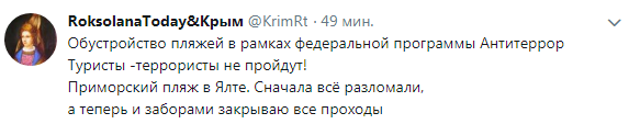 "Обустройство пляжей в рамках федеральной программы "Антитеррор". Туристы-террористы не пройдут!" – с иронией прокомментировала автор, добавив, что на снимках запечатлен Приморский пляж в Ялте, где оккупанты "сначала все разломали, а теперь и заборами закрывают все проходы".