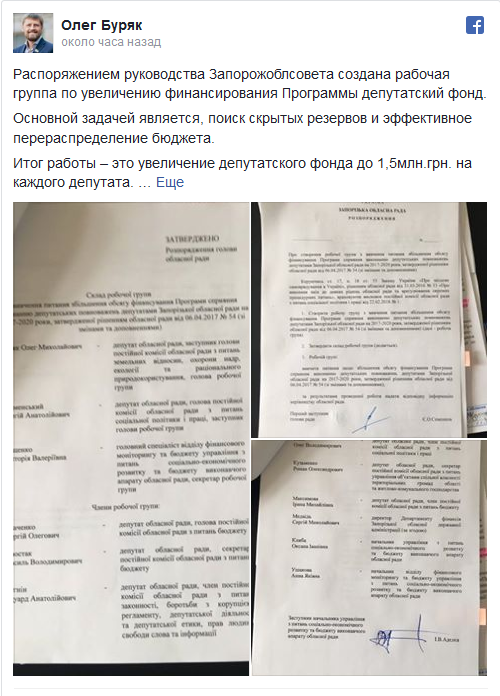 — Распоряжением руководства Запорожоблсовета создана рабочая группа по увеличению финансирования Программы депутатского фонда. Основной задачей является, поиск скрытых резервов и эффективное перераспределение бюджета. Итог работы – это увеличение депутатского фонда до 1,5 млн.грн. на каждого депутата, — пишет Олег Буряк. — Из них 500 тыс.грн. на материальную помощь гражданам и 1 млн.грн. на финансирование проектов на территории. Группа приступает к работе!