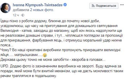 "Заходишь в магазин, чтобы хоть как-то наверстать еще не реализованные домашние дела, и тут цепляешься взглядом за предложения для украшения, окраски яиц, и получаешь моральный удар ниже пояса. Почему? Потому что наши креативные производители предлагают украшать пасхальные яйца матрешками", – написала изумленная Климпуш-Цинцадзе.