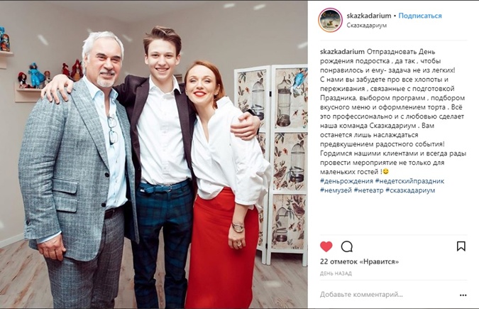 Праздник было решено устроить в интерактивном музее-театре. Аккаунт этого музея и опубликовал снимок Константина вместе с родителями. В подписи к фотографии сказано, что они могут легко организовать день рождения не только для маленьких гостей, но и для подростков.