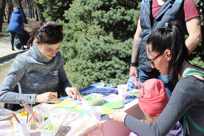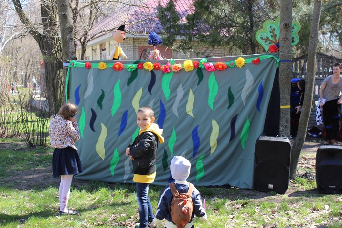А немного поодаль были организованы развлечения для детей. Ребята поменьше с увлечением смотрели представление кукольного театра, которое показывали недалеко от Поляны сказок. А около Аллеи славы проводились мастер-классы, где детишки шили, вырезали, клеили, создавая праздничную красоту для себя или же для своих родных.