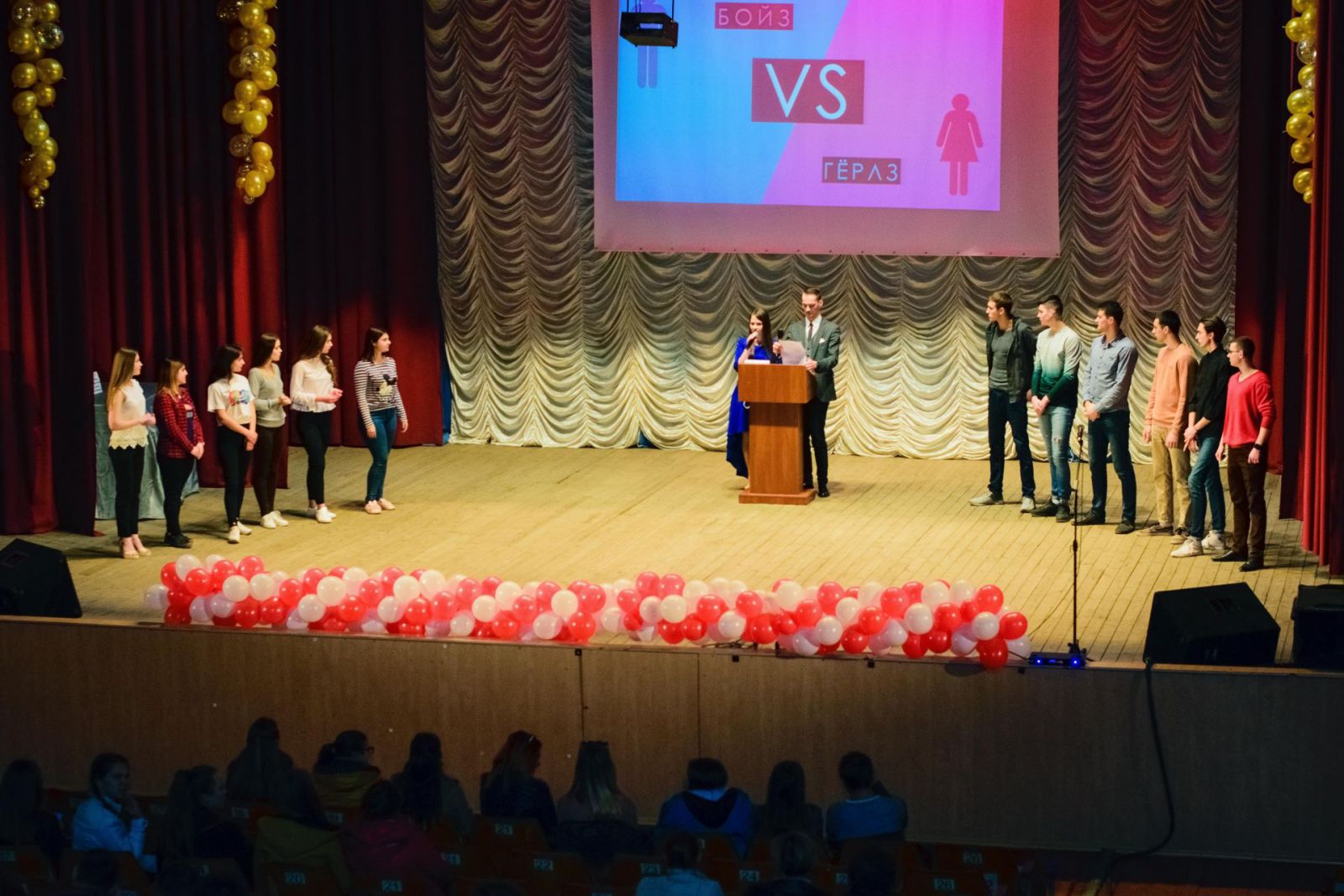 Девушки и парни, разделенные на команды, соревновались за звание самых умных, красивых, изобретательных, в общем самых-самых. Организовали батл факультеты экономики и бизнеса и инженерии и компьютерных технологий.