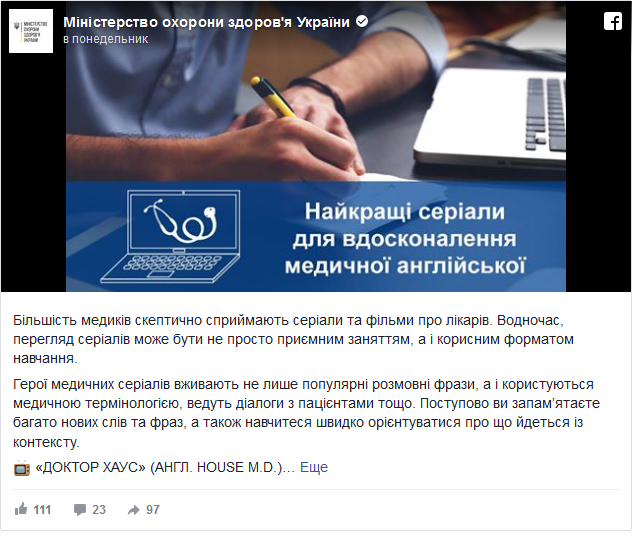 Министерство здравоохранения Украины посоветовало докторам повышать квалификацию при помощи просмотра сериалов о работе медиков. Об этом говорится в сообщении ведомства на странице в Facebook.