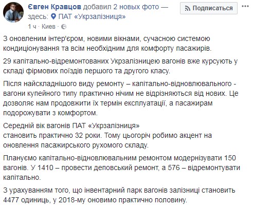 Евгений Кравцов также отметил, что после капитального ремонта вагоны мало, чем отличаются от новых, что в свою очередь позволяет увеличить срок их эксплуатации, а также позволяет пассажирам перемещаться с максимальным комфортом. Исполняющий обязанности главы "Укрзалізниці" также отметил, что в среднем срок эксплуатации пассажирских вагонов составляет около 30 лет. Именно поэтому в 2018 году "Укрзалізниці" вплотную займется капитальным ремонтом действующих составов. Так, по его словам, в текущем году на предприятии планирует модернизировать 150 вагонов, еще в около 1,5 тысячах вагонов проведут деповский ремонт. При этом еще около шести сотен вагонов отремонтируют капитально.
