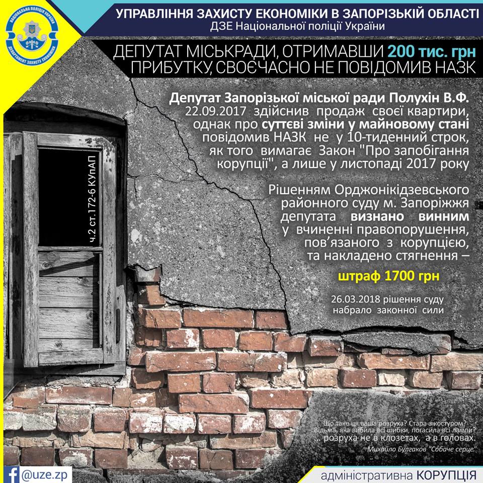 Как сообщили в Управлении защиты экономики, депутат Владимир Полухин продал свою квартиру за 200 тысяч гривен и не сообщил в течение 10 дней о поступлении “кругленькой” суммы на личный счет.