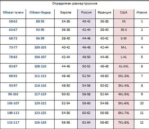 При определении размера трусиков нужно снять мерки с талии и бёдер. В первом случае сантиметровой лентой охватываем самую узкую зону, во втором – наиболее выдающуюся. Результаты сравниваем с данными из таблицы.