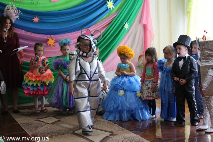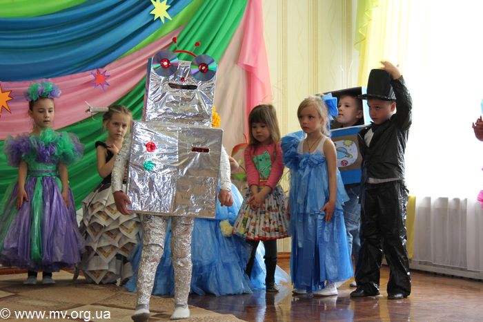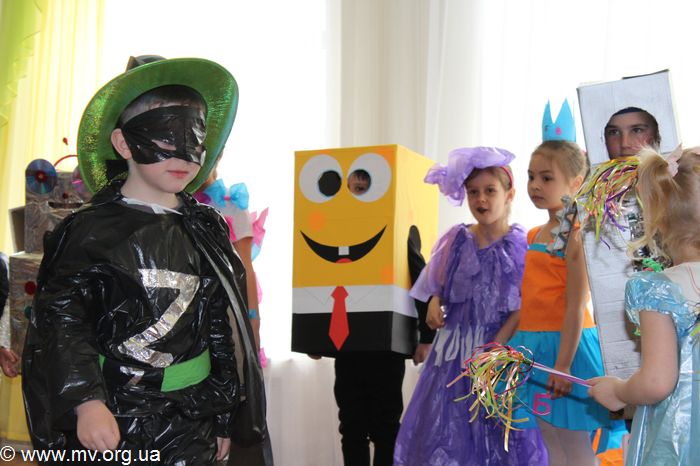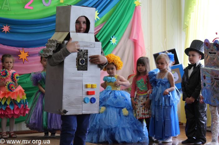 Костюмы своим детишкам изготавливали, конечно же, родители, которые постарались на славу. Девочек обрядили в сказочных фей и принцесс. Платья были изготовлены из полиэтилетновых пакетов, бумаги и старых газет, пластиковых стаканов. Мальчишек обрядили в Шредера и Бэтмена, космонавта, Губку Боба, робота и даже автомобильчик. Два последних костюма были изготовлены из старых коробок. При этом – тут явно постарался папа – у робота сзади автоматически крутился небольшой пропеллер. А костюм космонавта одному из мальчишек родители сделали из теплоотражающего материала.