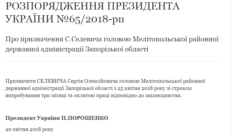 Президент Украины Петр Порошенко своим распоряжением назначил Сергея Селевича председателем Мелитопольской РГА