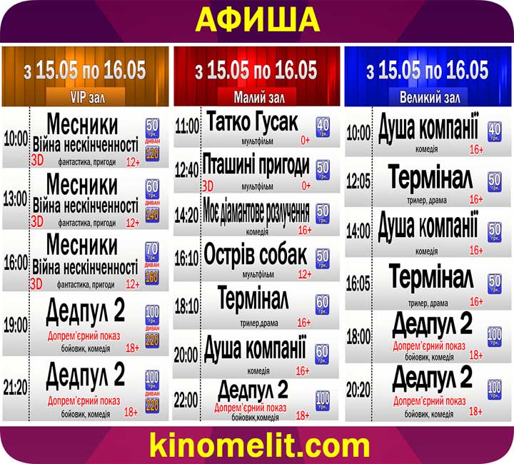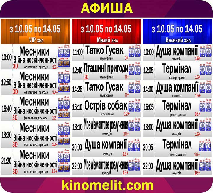 Все фильмы до 18:00 - 40 грн. После 18:00 – 50 грн.