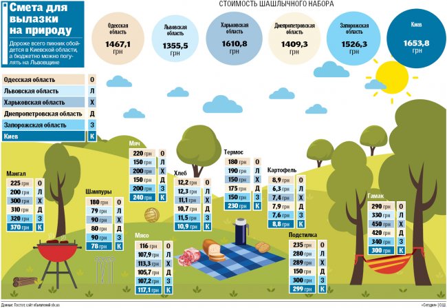 Также нужно помнить, что ни один пикник не обойдется без бутылки питьевой воды (от 20 грн за 6 литров), кетчупа (от 10 грн за упаковку в 300 грн) и одноразовой посуды (от 18 грн за набор из 10 вилок, тарелок и стаканов). Цены на эти товары по всей стране примерно одинаковые и не изменились с прошлого года. С учетом этих дополнительных расходов, если весь инвентарь для отдыха у вас уже есть, минимальный пикник без алкоголя обойдется в среднем 178 грн по регионам.