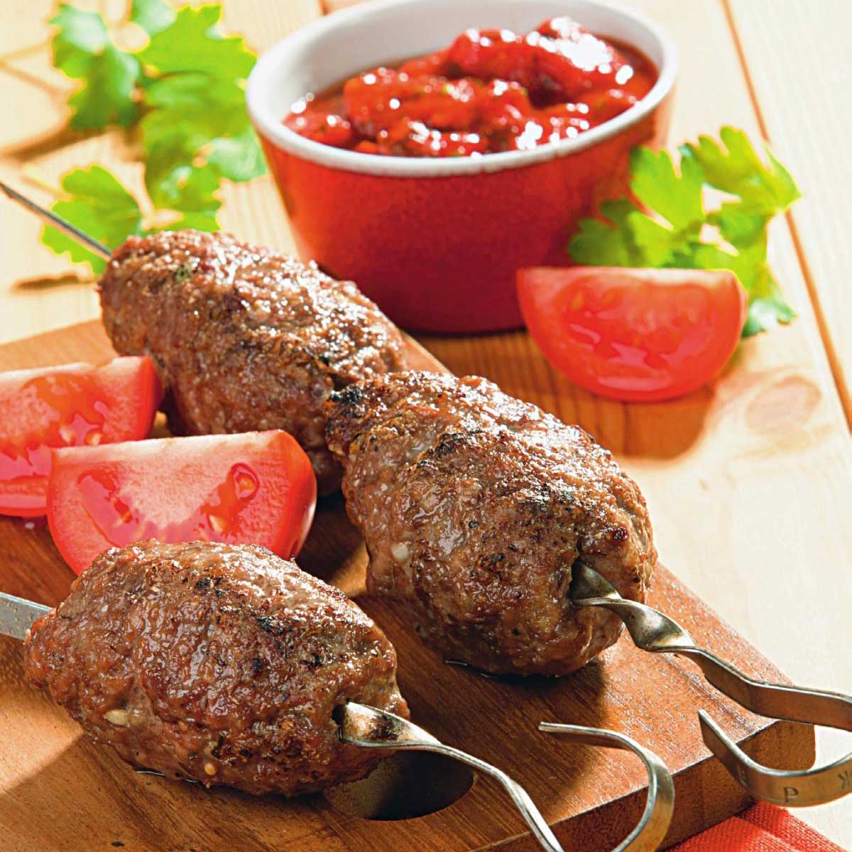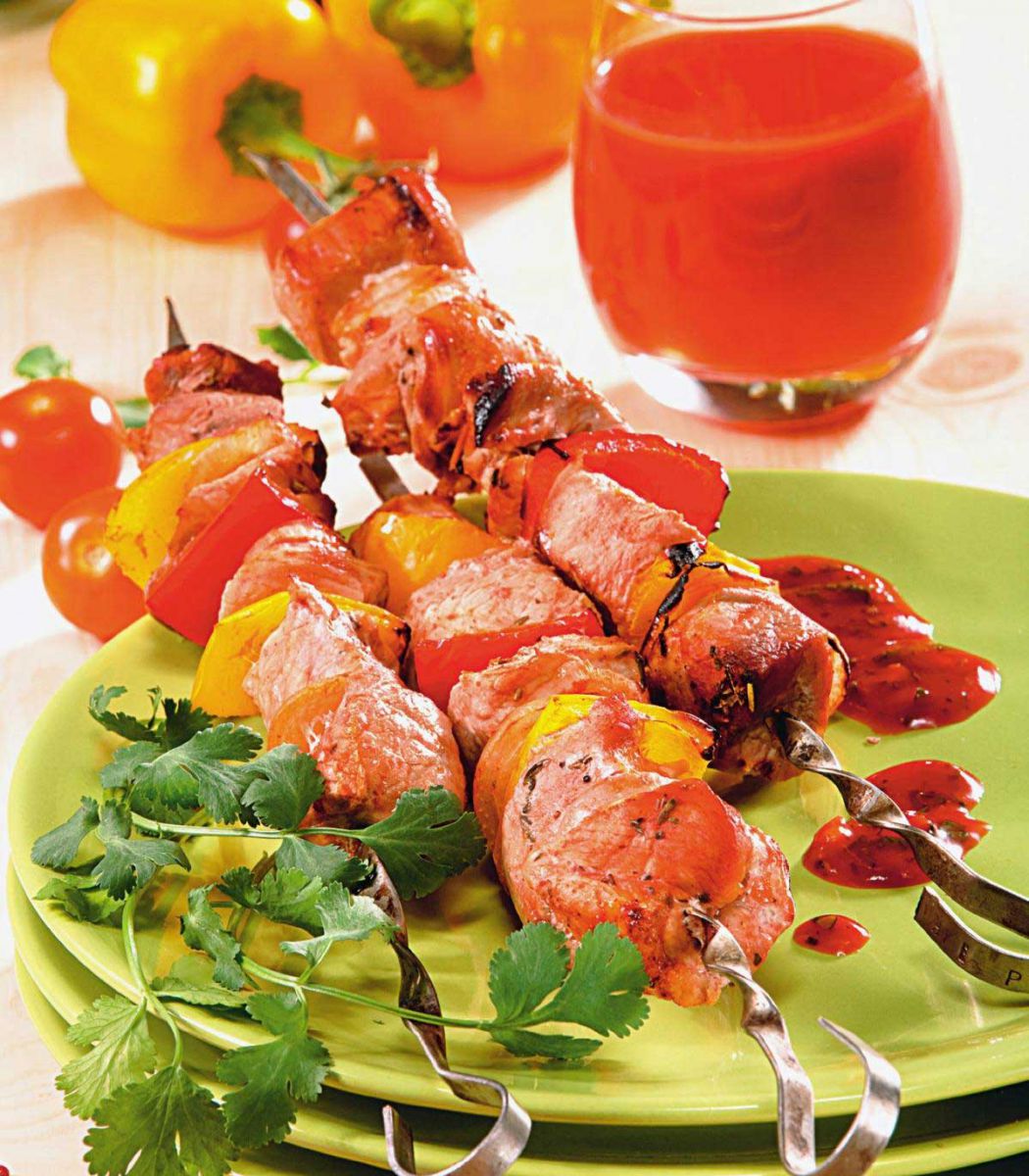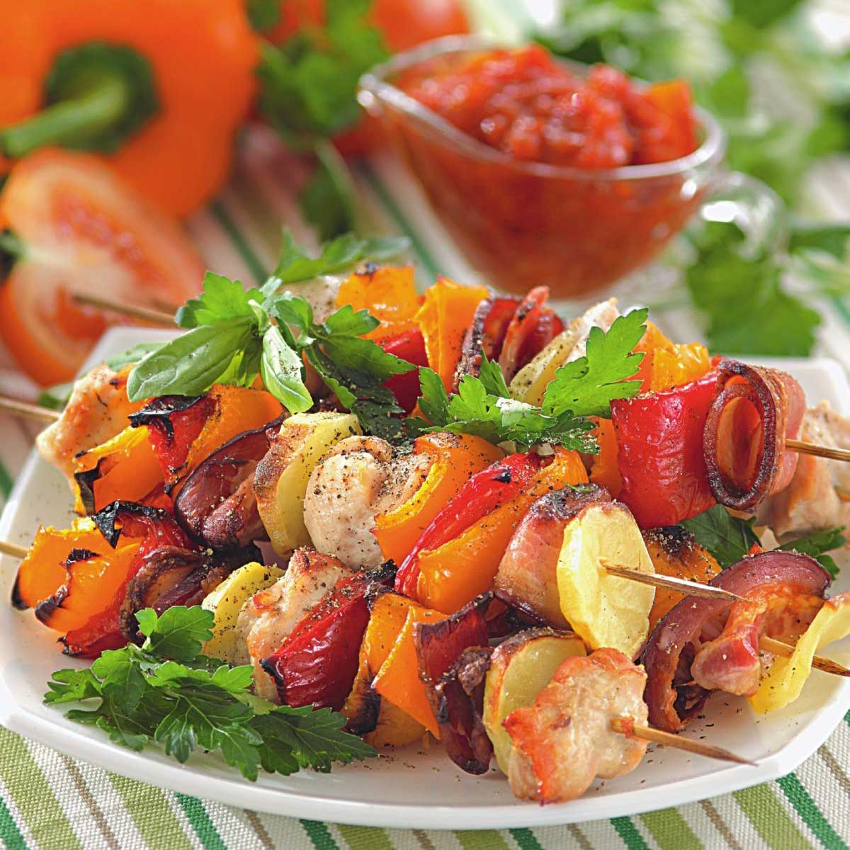 5. Подготовленные ингредиенты, чередуя, нанизать на шпажки. Обжарить со всех сторон на гриле или над открытым огнем до готовности, подать с томатным соусом.
