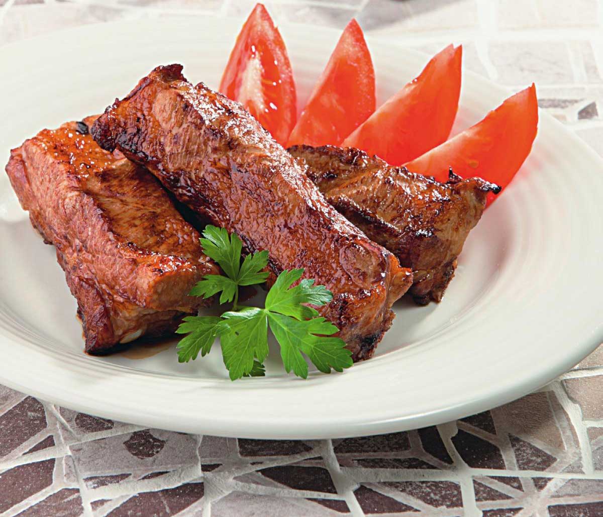 5. Помидоры и огурцы вымыть, крупно нарезать. Разрезать мясо между ребер на порционные куски и подать на стол с нарезанными помидорами и огурцами.