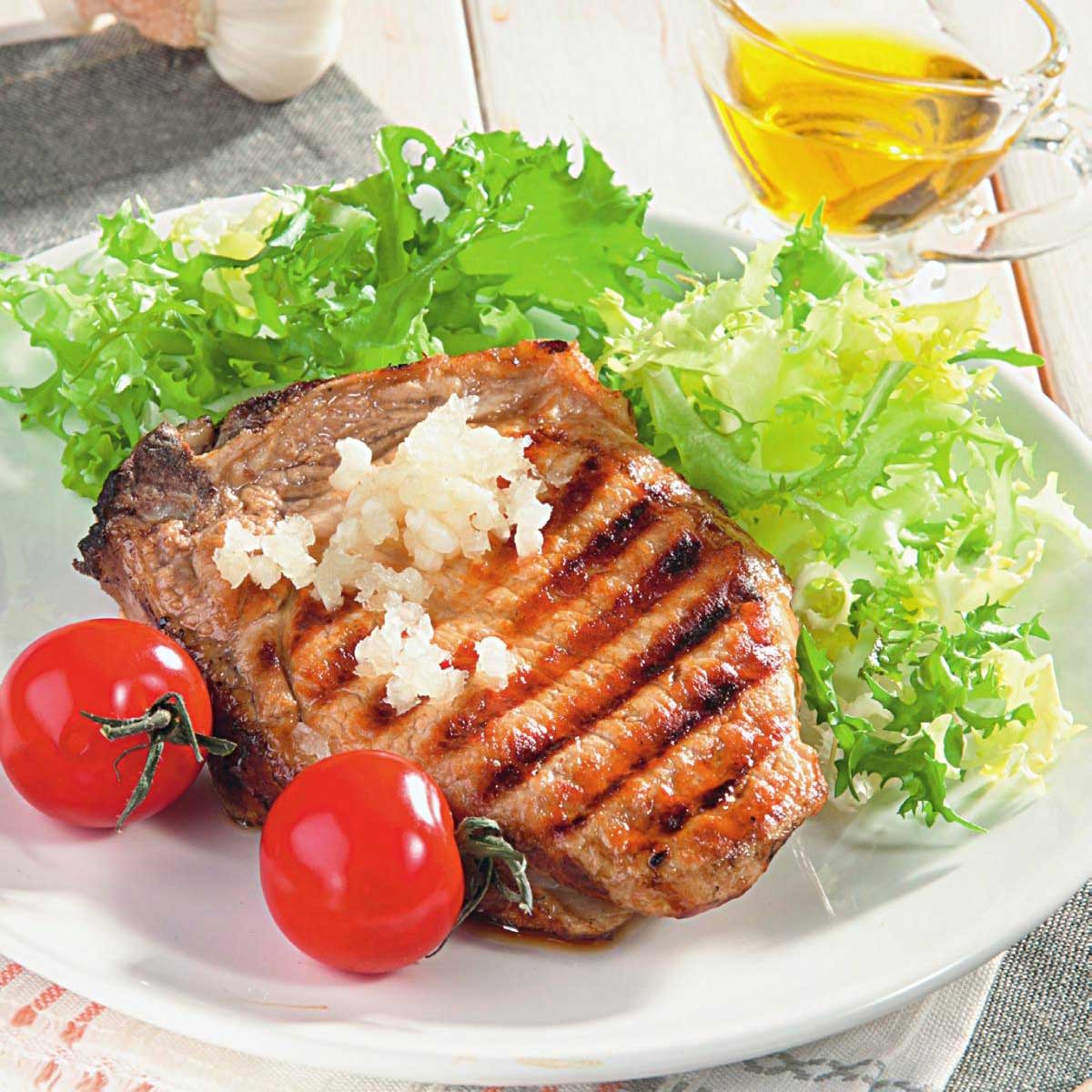 Гриль хорошо прокалить и смазать маслом. Обжарить свинину на гриле по 5 мин. с каждой стороны до образования корочки.