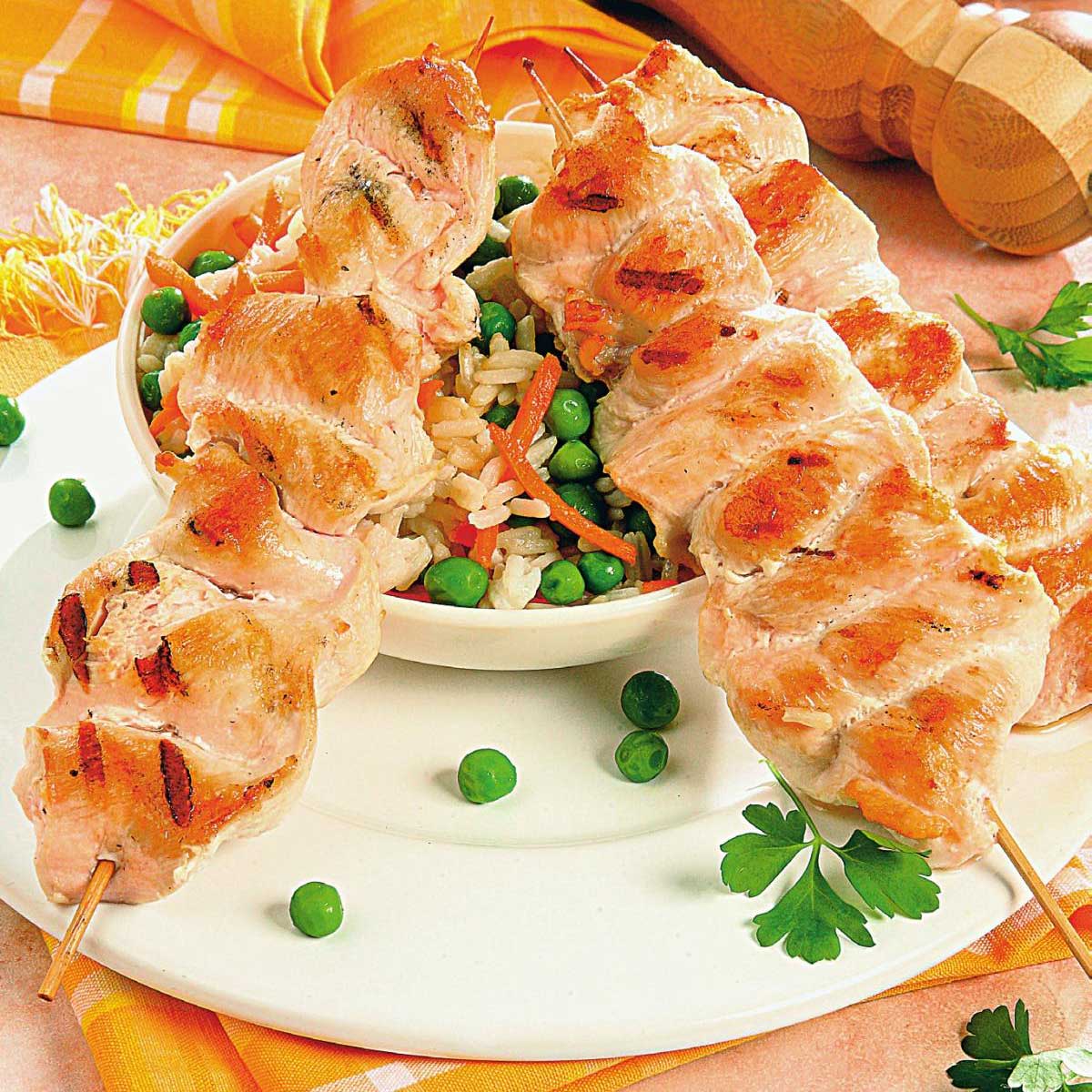 4. Куриное филе вынуть из маринада, смазать оливковым маслом, нанизать на шпажки, предварительно вымоченные в воде, обжарить на гриле в течение 15 мин. На гарнир подать гавайскую смесь.