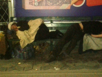 На улице Героев Украины, возле шахматной школы, на остановке обосновались бездомные.
